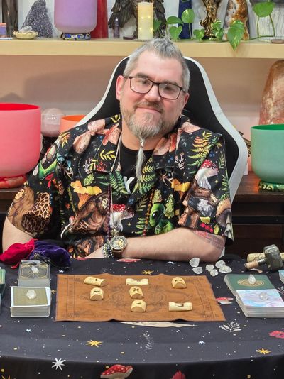 His practice extends across multiple traditions, including tarot and oracle reading, shamanic journey work, and Akashic exploration, as well as nature-based energetic work connected to the land.